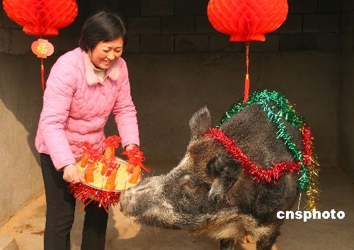 1月24日,山东枣庄市市中区野猪养殖专业户孙中林给饲养的一头千斤野猪过7周岁生日。她用这种独特的方式,庆贺野猪养殖场创办7周年。这头千斤野猪是孙中林在2000年创办养殖场时饲养的第一头野猪,体重已超过500公斤,成为“镇圈之宝”。近年来,孙中林靠饲养野猪致富,年纯收入80余万元。中新社发 吉 喆 摄