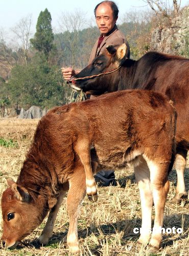 2月2日,湖南省邵阳县五峰铺镇过路塘村新石组农民蒋顺球家一头雌性黄牛犊引来许多人围观。奇怪的是,牛犊左前腿上又长出一条腿。据蒋顺球介绍,他家养的一头6岁黄母牛一年产一胎,这头牛犊是第四胎,生长正常,习性与别的牛没有异样。但令人不解的是,每胎都产于10月18日,同月同日,有三胎还是同时降生。当地上了年级的人百思不解,说这种现象从未见过。中新社发 李爱民 摄