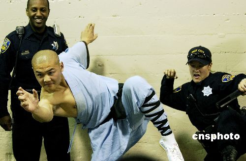 当地时间3月4日中国元宵节,美国旧金山华商请来各界人士参加元宵节联欢晚会,负责警卫的美国警察乘机向来自中国少林寺的武僧学艺。中新社发 陈钢 摄