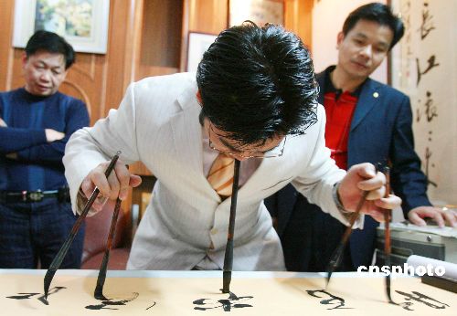 3月19日晚,来自浙江丽水的31岁青年叶根友在苏州市丰乐宫表演了他苦练十几年用五笔齐下挥毫书法的怪才“绝技”,令人叹为观止。据现场目击,叶根友两手拇指和食指、小指及无名指各夹一支,还用牙齿咬住一支,两手伸展开来气定神闲挥毫齐书,只见五支毛笔不停在纸上游走,4分钟后“鸿运当头照”五个大字便跃然纸上。中新社发 苏秀 摄