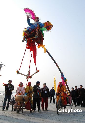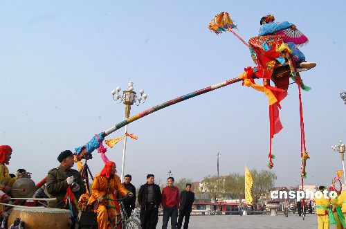 | 3月21日,在河南省淮阳县太昊陵二月庙会上,一种独特的民俗表演活动吸引了众人的眼球。只见一个人坐在一个高高的竹椅上,下面有个长长的竹竿支撑,几个人在下面拉着,竹竿架在一辆三轮车上,如同一个杠杆。坐在空中的人一会儿在椅子上玩扇子,一会儿躺在两个绳子上翻滚,精彩的表演引得下面的观众掌声不断。据介绍,这叫独竿轿,又叫闪竿轿、抬竿轿,是淮阳古老的民俗表演活动之一,在当地已经消失了近40年。古时表演时需要16个人,现在经过改装,变成了独竿,只要6个人就能完成。中新社发 杨正华 摄