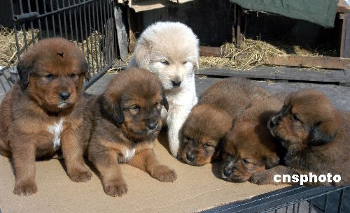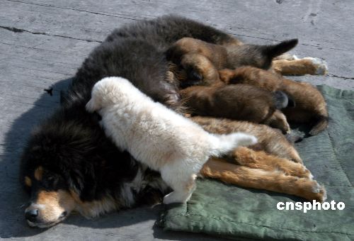 黑龙江牡丹江某藏獒养殖基地的一只黑色藏獒“铁包金”产下6只小崽,令人称奇的是,其中一只是全身雪白的小雪獒。这只生产的母藏獒一岁,毛色为黑色,是第一次怀孕生产。这只小雪獒的父亲是一只黄色藏獒,这次产下的6只小藏獒中有5只是黄黑色的,出现雪獒这应该和雪獒的父亲——这只黄獒身上有雪獒的隐形基因有关。有多年犬类饲养经验的于先生说,自己养了多年藏獒,2007年春节前后饲养的7只成年藏獒产下60多只小藏獒,像这种浑身雪白的藏獒还是第一次见到。中新社发 张克非 摄