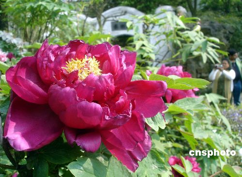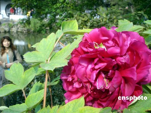 4月8日,古城苏州气温上升,拙政园内的牡丹竞相怒放,在绿叶的陪衬下,显得十分鲜艳,格外迷人,吸引了众多游客。中新社发 王建康 摄
