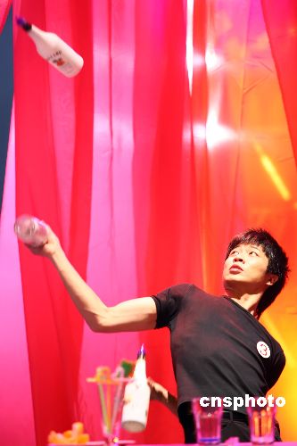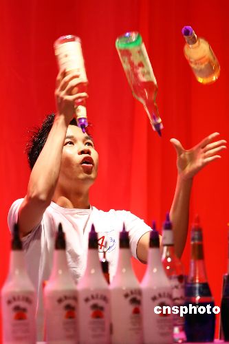 2007年4月30日,广西电视台都市频道主办的广西首届调酒王争霸赛在广西电视台演播厅举行。选手进行了传统调酒和花式创意调酒等比赛。中新社发 骆文刚 摄