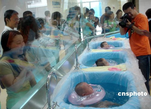 5月27日,苏州市立医院母子医疗保健中心内,举办了一场别开生面的婴儿游泳比赛。28名出生在6个月以下的小宝宝经过预赛后参加了当天决赛。比赛分1-2个月、3-4个月、5-6个月三组进行。据悉,婴儿游泳比赛不是比谁游的速度快,而是在规定的时间内,比婴儿在水中的动感姿态、表情及与母亲抚触交流的神态,精彩的比赛逗得在场观众们笑逐颜开。中新社发 王建康 摄