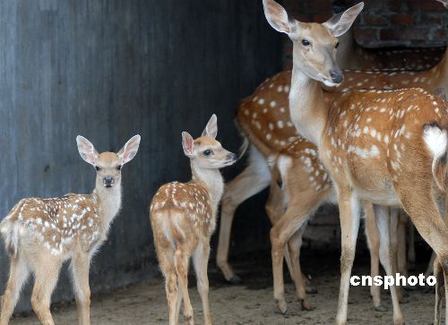7月3日,“龙凤胎”梅花鹿兄妹。山东潍坊市石桥村村民朱树成饲养的一只梅花鹿一胎产下两仔,一只雄性,一只雌性。这对“龙凤胎”鹿兄妹今年6月1日出生,体形及身上的斑点都极为相似,出生一个月来两兄妹时刻寸步不离。据悉,梅花鹿一胎产下两只幼鹿且是“龙凤胎”的概率很小,约在万分之三。中新社发 亦剑 摄