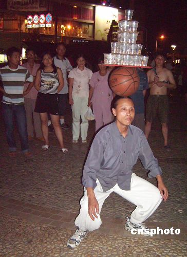 头顶篮球,篮球上放着25杯水,绕着近千米的街心公园一口气走上4、5圈。7月8日晚,记者见到了这位40余岁的湖南奇人龚海涛。从8岁开始头顶篮球徒步走,到篮球上放一杯水,再到目前的25杯水,龚海涛目前正在着手申报吉尼斯世界纪录。中新社发 肖前辉 摄