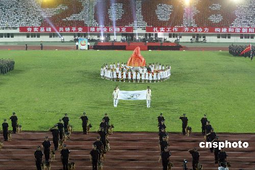 八月三日晚,北京朝阳区举行“平安奥运 好运北京”誓师大会,来自不同界别的方队参加了检阅,消防搜救犬以及四十六只警犬进行了现场表演,由三千零六十四名观众组成的“2008”图形格外醒目。朝阳区是北京2008年奥运主场馆所在地,承担有竞赛和非竞赛场馆、训练场馆、开放型场地等三十二处;奥运官员、运动员住地五十处;定点医院三处,责任重大。中新社发 任海霞 摄