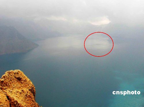 八月十九日,百余名游客在长白山天池游玩时,目睹了“天池怪兽”的出现。目击者称,下午六时,天池水面出现两个黑点,刚开始安静不动,十几分钟后,它们开始游动,水面立即掀起巨大的浪花,最后消失。中新社发 朱文龙 摄