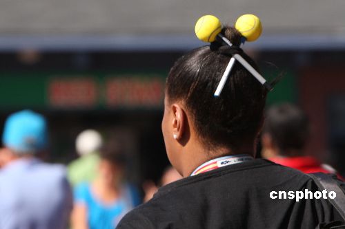 当地时间九月一日,美国网球公开赛进程过半,球迷热情不减。也有球迷别出心裁,将网球纪念品变成发簪,醒目而别致。中新社发 李静 摄