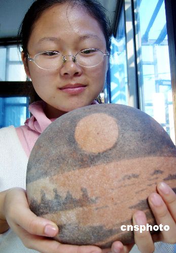 10月28日拍摄的天然奇石“嫦娥奔月”。当日,苏州顾小姐展示一块“嫦娥奔月”的黄河石,该石呈扁圆状,宽34厘米、高40厘米,平滑的表面有一个直径大约5厘米的圆,呈黄色,像一轮满月。中新社发 李俊锋 摄