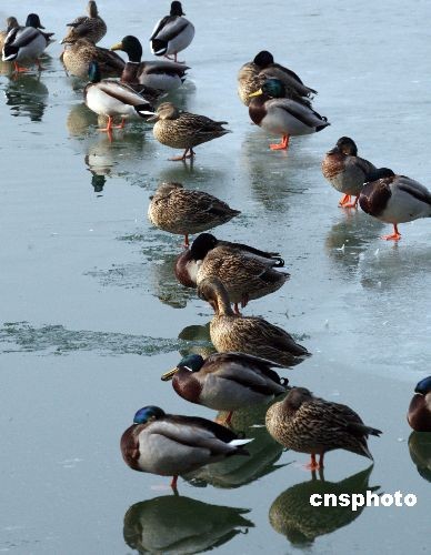 2月16日,连日温暖的阳光拥抱着初春的北京,北京皇家园林北海公园内湖冰渐渐开融,幽雅的环境招来百余只野鸭子、鸳鸯飞落栖身、嬉戏,吸引众多游客观赏。中新社发 钱兴强 摄