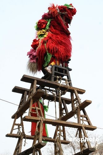 2月22日,一支“高空狮子舞”社火队在河南许昌市区为市民表演。在河南省许昌县尚集镇沈村,保留着一种大型民间社火“高空狮子舞”。每年从农历正月初一到元宵佳节,沈村的“高空狮子舞”社火队都要到周边地方进行巡回演出。 中新社发 牛书培 摄