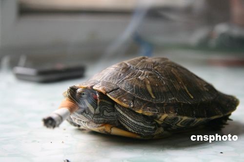 家住吉林省永吉县口前镇的云先生家养了一只“会吸烟”的乌龟。据云先生介绍,这只乌龟是他三年前从市场上买回来的,云先生每次吸完烟,将剩下烟头塞给小乌龟吸上一口。时间长了,乌龟染上了“烟瘾”,只要看到云先生吸烟,这只乌龟就把头从水里伸出来,着急地在水盆转,直到云先生把剩下的烟头塞到它嘴里。中新社发 葛治含 摄