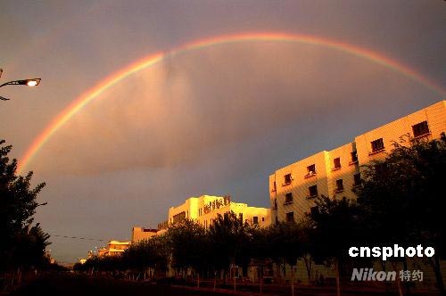 7月15日晚9时10分左右,新疆吐鲁番市上空出现一道完整美丽彩虹,持续近10分钟,街头行人纷纷驻足观看。中新社发 刘健 摄