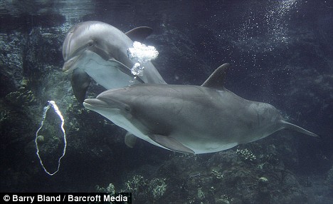 海豚通过它们的呼吸孔吹出一个又一个气泡,然后和这些气泡玩耍,有的海豚用嘴小心翼翼推着气泡在水中前进,有的试图将气泡来回旋转,有的还想从巨大的气泡中间穿过,有的则直接将吹出来的气泡弄破。和孩子们吹出五颜六色的肥皂泡在空中跳跃一样,在海豚的照顾下气泡在水中同样可以变出很多让人匪夷所思的画面。