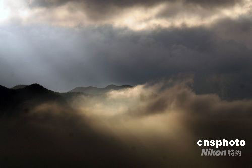 9月16日清晨,浙江天台山,阳光透过厚厚的云层照耀在缭绕的云雾上,美不胜收。当日,第13号强台风“森拉克”离开浙江省。中新社发 丁必裕 摄