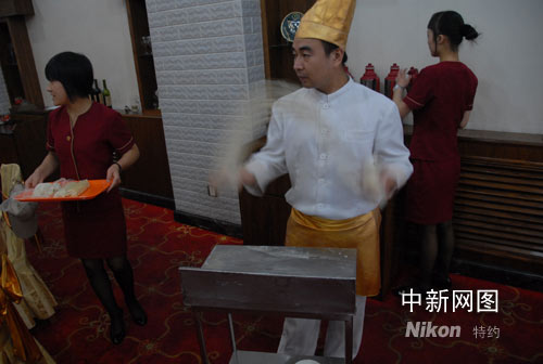 兰州人吃牛肉面吃出了名堂,吃上了瘾。如今,兰州市的每条街巷,无论大小,至少都有一两家牛肉面馆。黄河岸边的古城兰州,弥漫在大街小巷的,永远有那股牛肉面的清香。“兰州人三天不来个‘牛大碗’就心火难捺”。听起来有点夸张,不过,牛肉面确实已成为兰州人生活中不可或缺的一部分。别以为煮面条加上牛肉片就是牛肉面了。兰州牛肉面的精致与吃法考究令人瞠目。观看拉面好像是欣赏杂技表演,拉面师傅操起面节,一搓一拉,连抻数次,即变戏法似地拉绕出一碗细长的面条拉到最后时的“一拉一闪”又仿佛是舞蹈演员在挥舞着彩带。王红纲 摄