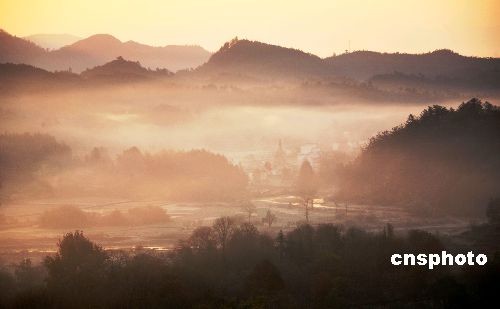 11月29日晨,东方泛出灿烂的朝霞,照射着安徽黄山脚下的千年古镇许村。中新社发 方也广德 摄