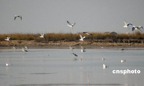 12月6日,在江苏连云港市临洪口沿海湿地,数千只灰鹤、鹭鸟、绿头鸭、红嘴鸥等候鸟来此越冬繁殖。它们或在天空中自由翱翔,或在水中盘旋觅食,场面甚是壮观,沿海湿地变成了海鸟的乐园。目前,面积达116平方公里的临洪湿地保护工作已经启动,连云港将把临洪河口湿地打造成集滨海湿地、城市湿地、农耕湿地、文化湿地于一身的城市中央湿地公园。中新社发 王春 摄