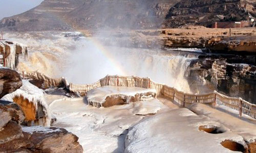 图:黄河壶口瀑布出现彩虹冰挂美景