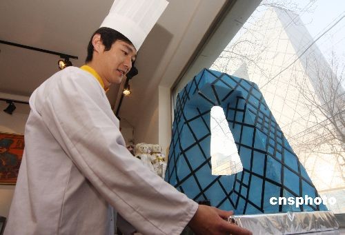 12月12日,在北京某蛋糕店,一位师傅正将自己制作的“央视蛋糕楼”摆上窗台。近日,一个高约70厘米,模仿中央电视台新台址外形制作的蛋糕亮相北京某蛋糕店,吸引了路人的目光。中新社发 吴芒子 摄