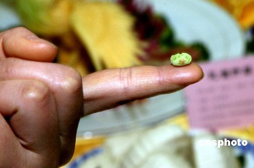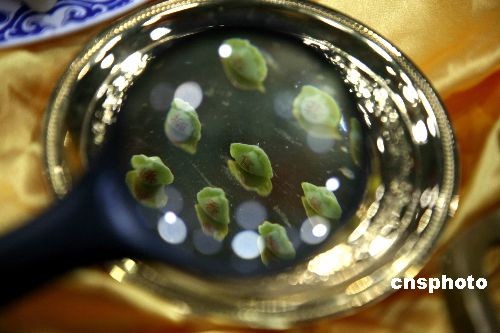世界上最小的饺子有多大?12月20日上午,在济南举办的第二届齐鲁民间膳食文化艺术节开幕式上,直径仅有8毫米的齐鲁珍珠饺亮相。饺子的馅由珍珠泉内养殖的花莲鱼肉调成,每个上面还有文字,须通过放大镜才能看清。中新社发 王辉 摄