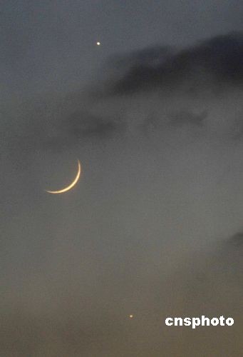 12月29日傍晚,在大连市西南方低空处,弯月的右下方有一颗土黄色星星,距离只1度左右,正在引导着弯月慢慢下沉。这就是2008年度最后一个有趣天象:木星会弯月相约人马座。中新社发 刘德斌 摄