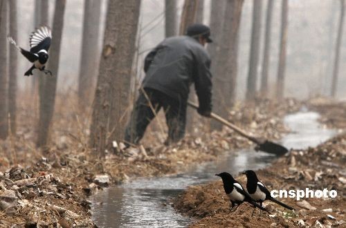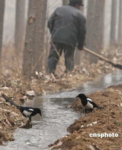 2月6日,河南洛阳嵩田湖镇农民引来嵩伊渠水流灌溉干旱的油菜地,一些喜鹊也趁机追逐水流,嬉戏解渴。中新社发 张晓理 摄