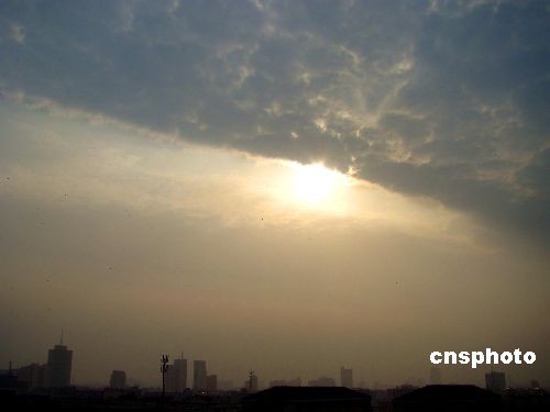 2月21日傍晚时分,扬州上空出现“阴阳天”奇观,一半是万里无云的晴朗天空,另一半天空则被厚实云层遮盖,界线清晰分明,蔚为壮观。中新社发 陈中秋 摄