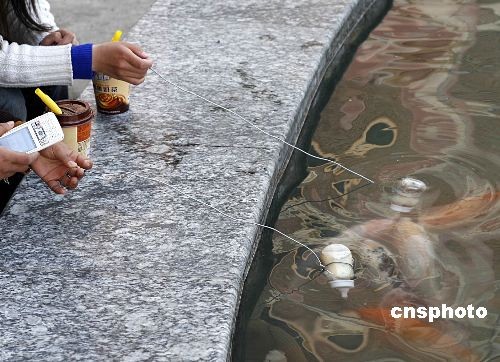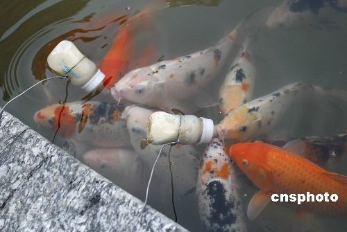 3月中旬,工作人员喂养“喝奶”的鱼。在浙江东阳横店影视城香港街景点内,养在水坛中的观赏锦鲤是普通锦鲤与日本某锦鲤杂交后培育的品种,喂养它们则需要将饲料装灌进婴幼儿奶瓶中,该饲料的颜色如“乳奶”一般,然后将奶瓶用铁丝系住放入水中,随后,这些鱼儿就会围拢过来,争抢着用奶嘴吸“奶”喝了。