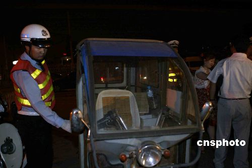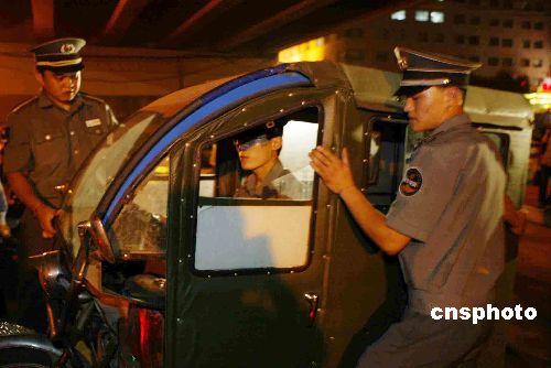 七月二十日晚,北京展开清理“黑摩的”行动。“黑摩的”是指驾驶者驾驶三轮摩托车违法上路、非法运营、非法聚集揽客等非法行为。由于“黑摩的”违法、不安全驾驶等行为,一年内已造成数十人死亡。为此,市政府的相关部门从二十日起将对“黑摩的”实施全天候的打击和治理。中新社发 任海霞 摄