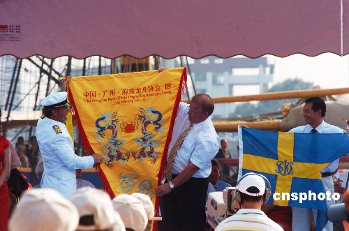 二十一日下午,“歌德堡号”仿古船抵达位于广州洲头咀的“歌德堡号”博物园,参加广州市海珠区举办的“龙舟激扬迎古船”活动,歌德堡号船长与海珠区互相交换船旗。中新社发 柯小军 摄