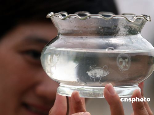 | 7月25日,在济南市水帘峡景区的小天池里发现上千只“桃花水母”群。这些被捞起的水母呈圆形伞状,约有一角硬币大小,身体周边长满了触角,靠身体一伸一缩前进。小天池位于海拔600多米处,水深50多米,由山泉汇集而成。桃花水母是地球上最原始、最低等的无脊椎动物之一,有几亿至十几亿年以上的生存历史, 素有“水中大熊猫”之称。迄今世界上发现11种淡水水母,我国有9种。如此多的“桃花水母”现身一地在国内实数罕见。中新社发 龚辉 摄