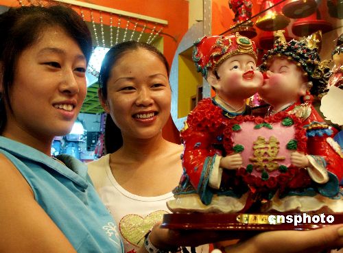7月30日,两位女孩在河南省开封市一精品店里观赏富有中国传统的情侣饰品。7月31日(农历七月初七)是中国传统节日七夕,源于牛郎织女爱情故事的七夕也是中国一个古老的浪漫爱情节日,古城开封的不少精品店里富有中国传统的情侣饰品很受人们的喜爱。中新社发 凯枫 摄