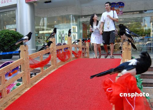 7月29日,一对情侣从商场门前的鹊桥走过。厦门市一家百货商场为营造中国情人气氛,在百货门前造了一座充满东方韵味的木质鹊桥,十几只“喜鹊”停歇在桥上。中新社发 杨戈 摄