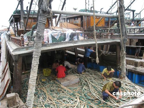 8月3日,广西气象部门发布台风黄色预警信号。受今年第六号热带风暴“派比安”的影响,预计二十四小时内,北部湾海面将出现八至九级大风天气。广西北海、钦州、防城港沿海五千余艘刚结束休渔的出海渔船纷纷回港避风。图为广西北海渔民正用缆绳对渔船进行加固。中新社发 冯抒敏 摄