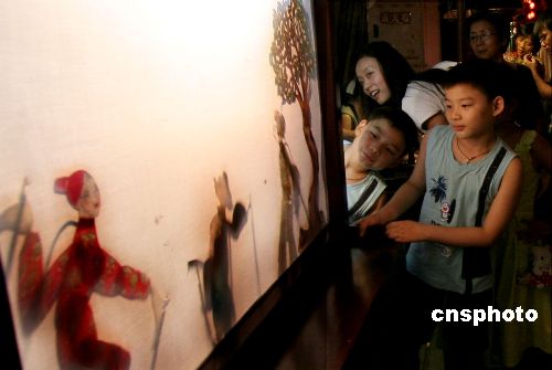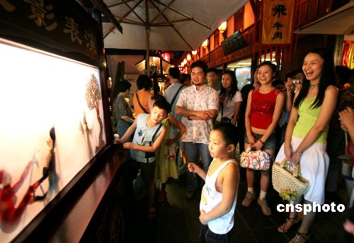 成都锦里老街上的孩子和大人们一起观看皮影戏。当晚,成都锦里老街上演了一出动感皮影戏,艺人在现代摇滚乐的伴奏下将传统的皮影戏表演得活灵活现,吸引了不少游客驻足观看。中新社发 王璋闻 摄