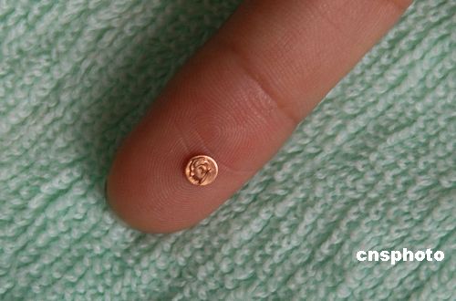 广州中山大学老师黄荣收藏毛主席像章数万枚,其中一枚直径仅三毫米。图为黄荣收藏的微型毛主席像章。中新社发 罗仰明 摄