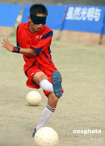 2006年8月8日,几位盲人足球队员在进行以比带训的练习。当日,河北省盲人足球队在邢台市集训,备战即将开始的第二届全国盲人足球锦标赛。在2005年12月7日海口市举办的首届全国盲人足球锦标赛上,河北队曾因一个乌龙球以1:2惜败江苏队获得亚军。中新社发 岳立中 摄