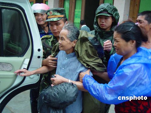 8月10日下午3时许,在第8号超强台风“桑美”登陆前,浙江省温州市平阳县受台风正面袭击,狂风大作、暴雨倾盆,17名群众被围困在危房中,情况万分危急。平阳边防大队接警后,立即派出抗台应急分队前往营救,经过两个多小时的努力,17名遇险群众被成功解救。中新社发 吴水斌 摄