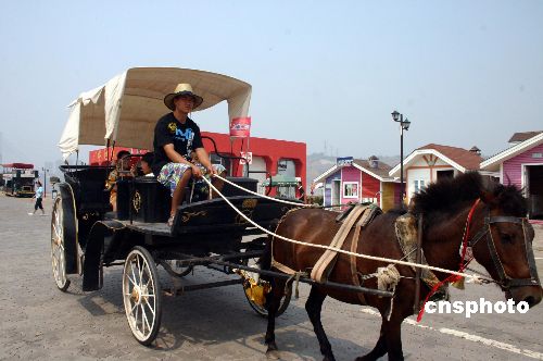 八月二十五日,几名小朋友在重庆美心洋人街乘坐欧式马车兜风观光。美心洋人街是重庆南滨路四期示范段工程——长江风情园的首期示范工程。目前试开园的仅是五百米长的首期示范工程,让当地市民在市区就能感受漫步欧洲小镇和举行盛大婚礼派对的滋味。中新社发 郭晋嘉 摄