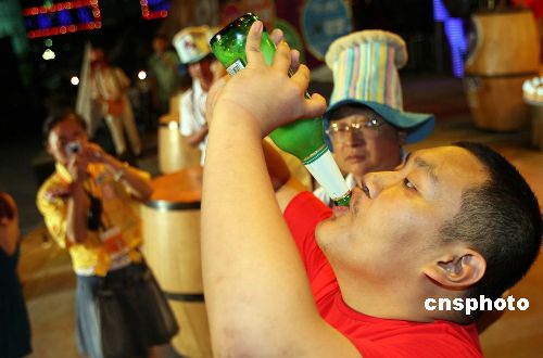 八月二十七日晚,中、韩、俄等16个国家的200多名饮酒高手参与的饮酒大赛,经过个人吹瓶、 1500毫升大杯速饮和一分钟速饮三轮考验,最终青岛的姜国庆平稳发挥,以累计成绩第一获得第十六届青岛国际啤酒节“酒王”称号。当晚,第十六届青岛国际啤酒节落下帷幕。中新社发 杜洋 摄