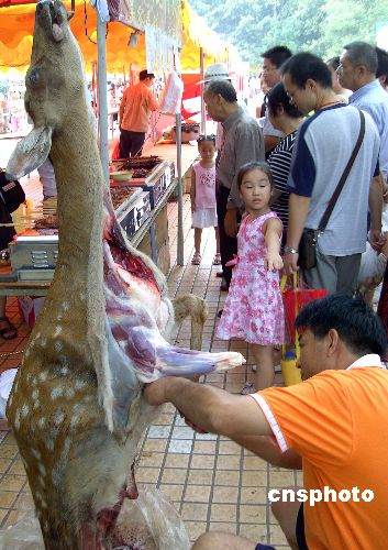 2006年9月1日,为期9天的三峡美食文化节在湖北宜昌市滨江公园内举办,来自全国各地的近百种名小吃吸引了许多市民。其中,一来自吉林的经营烤梅花鹿肉串的商家现宰现烤人工驯养的梅花鹿,虽然该商家持有《吉林省野生动物收购销售加工许可证》,准予经营人工驯养鹿产品,但不少市民认为如此血淋淋的吃法太残忍。中新社发 刘君凤 摄