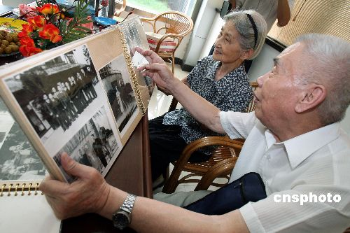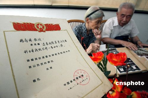 9月1日,82岁的史泽华(时任国民政府中国军事代表团联络官)与杨寿林(时任东京审判大法官梅汝熬秘书)遗孀孙美成在苏州见面,两位老人共同追忆了东京审判的那一幕,并一起观看了当日在苏州开映的影片《东京审判》。中新社发 徐志强 摄