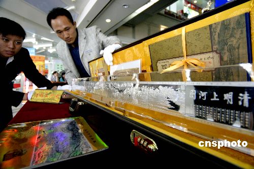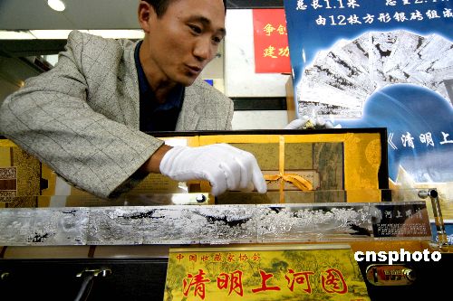 9月5日,一套银雕《清明上河图》运抵山东省临沂市新华书城,吸引了众多顾客的眼球。据了解,这套收藏版银雕《清明上河图》价值2.28万元,是由12块银砖组合而成,总重2.4公斤,长达1.1米。是雕刻大师运用浮雕立体的表现手法将原作品中600多个人、牲畜、船只和桥梁等逼真地表现出来,整个银雕层次丰富,纤毫毕现,仿佛将人们带回到一千年前繁华的汴梁都城。中新社发 朱武涛 摄