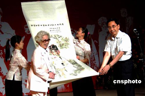 九月六日,红线女艺术中心成立十周年庆贺活动在广州红线女艺术中心举行。著名粤剧艺术家红线女从艺六十八周年,创造了享誉海内外并代表着当代粤剧最高成就的“红腔”和红派表演艺术。图为广东省委常委、广州市委书记朱小丹代表市委市政府向红线女艺术中心赠送了纪念品。中新社发 刘卫勇 摄
