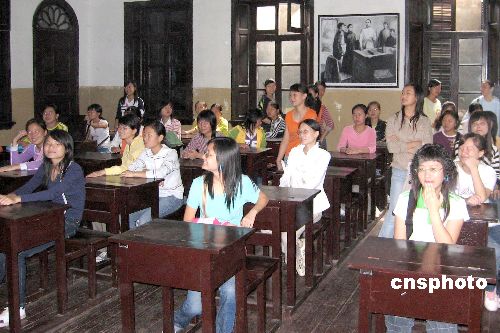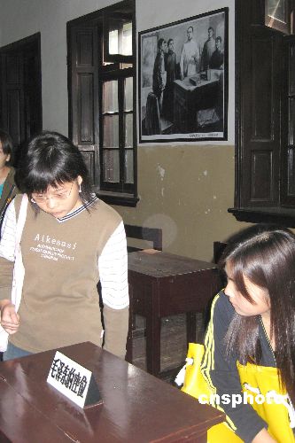 九月八日,一批在毛泽东母校——湖南省立第一师范参观的大学生坐在毛泽东曾经上课的教室,体验当年情景。据悉,毛泽东一九一三年至一九一八年在此就读,现在这里已经成为青少年爱国主义教育基地。中新社发 刘双双 摄