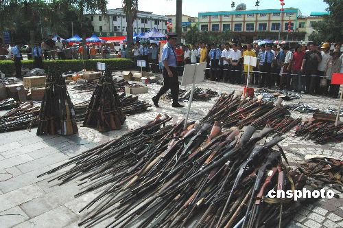 九月八日,中越边境城市广西崇左市警方缴获的一千三百多支非法枪支和一批爆炸物。自五月十日起,崇左市警方展开专项打击收缴非法枪支和爆炸物行动,并于九月八日集中销毁这些收缴枪支和爆炸物。中新社发 蒋雪林 摄