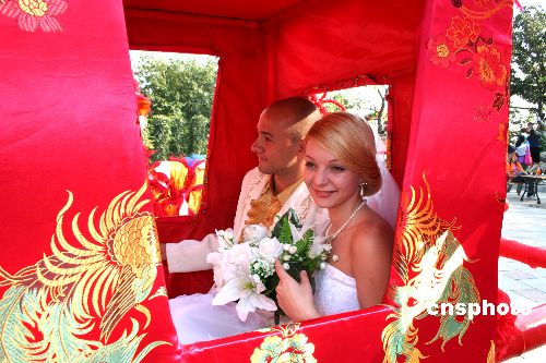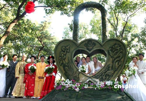 9月10日,辽宁大连国际旅游婚庆节集体婚礼活动在该市燕窝岭婚庆公园举行,来自中国、俄罗斯、美国、韩国、日本的数十对情侣喜结良缘,新人们在公园里共植爱情树、同系爱心锁。中新社发 徐德武 摄